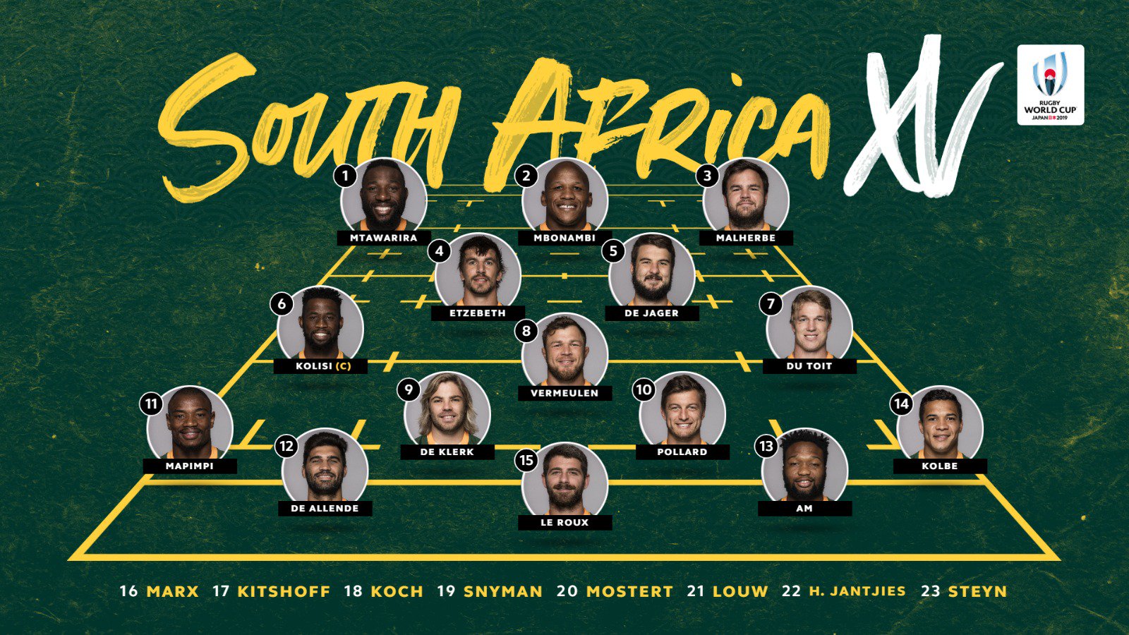 El poderío de los Springboks es conocido por la fuerza que imponen sus forwards y de hecho en el banco de suplentes habrá sólo dos backs. Esto les permite cambiar casi un pack entero para asegurarse de no perder las fuerzas en un desafío formidable para los dos mejores equipos de esta Rugby World Cup.